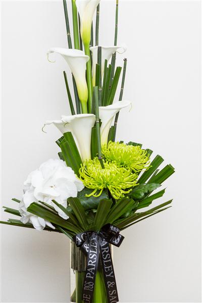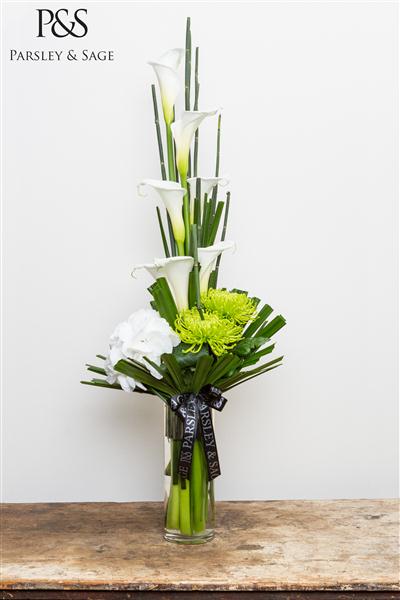 A sculptured selection of the finest Calla Lilies, Blooms and mixed exotic foliage's creating the most elegant of floral arrangements. Designed in a vase for style and ease. Our Calla Lily vase is designed using only the freshest and finest flowers available and is ideal for any occasion and any home.