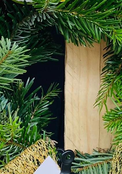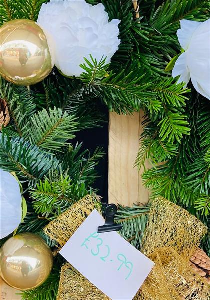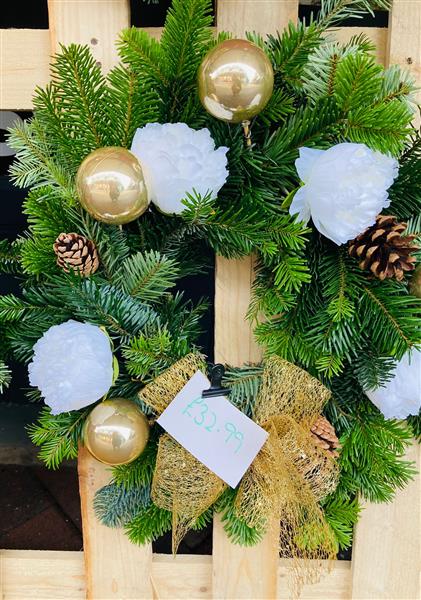 A hand made wreath on a moss base. Using fresh spruce, pine cones, baubles, white florals and bow.