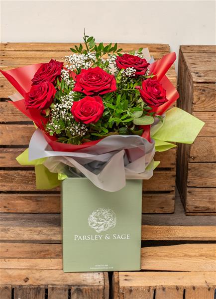 6 wonderful red roses with all the trimming.
