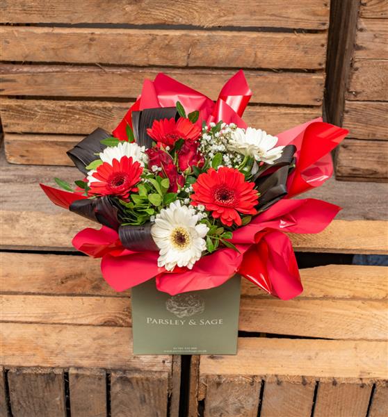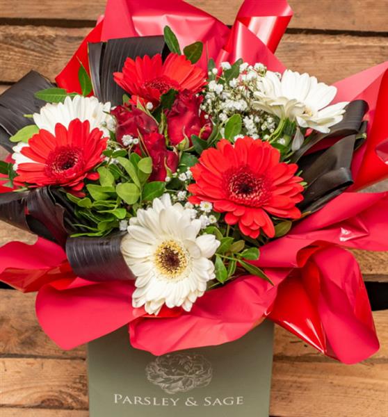 An all round handtied design in our petit gift boxes. We will use a seasonal selection in reds and whites and may vary from photo.