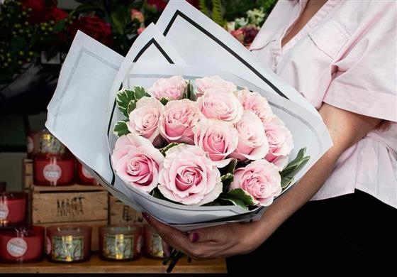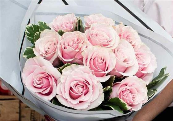 A dozen best quality soft pink roses with a touch of foliage and paper gift wrapping.