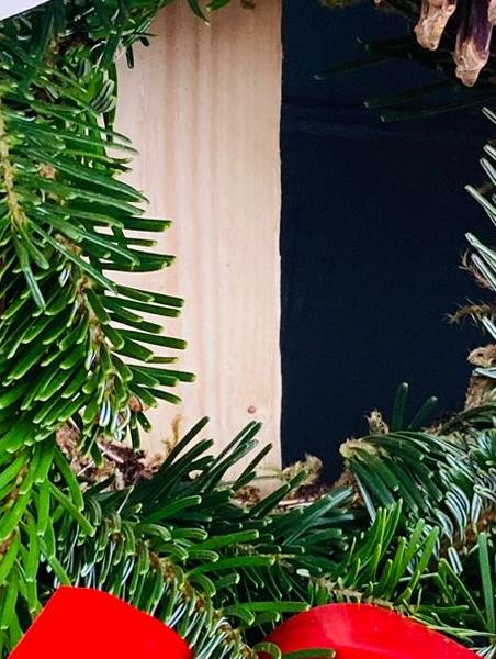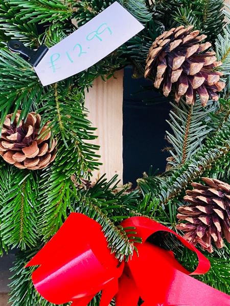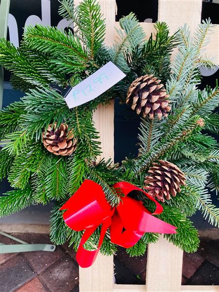 A hand made wreath on a moss base. Using fresh spruce, pin cones and a red bow. Suitable for outdoors.