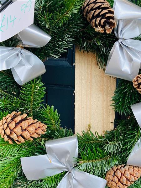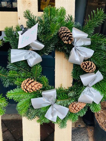 A hand made wreath on a moss base. Using fresh spruce, pine cones and little waterproof ribbons. Suitable for outdoors.